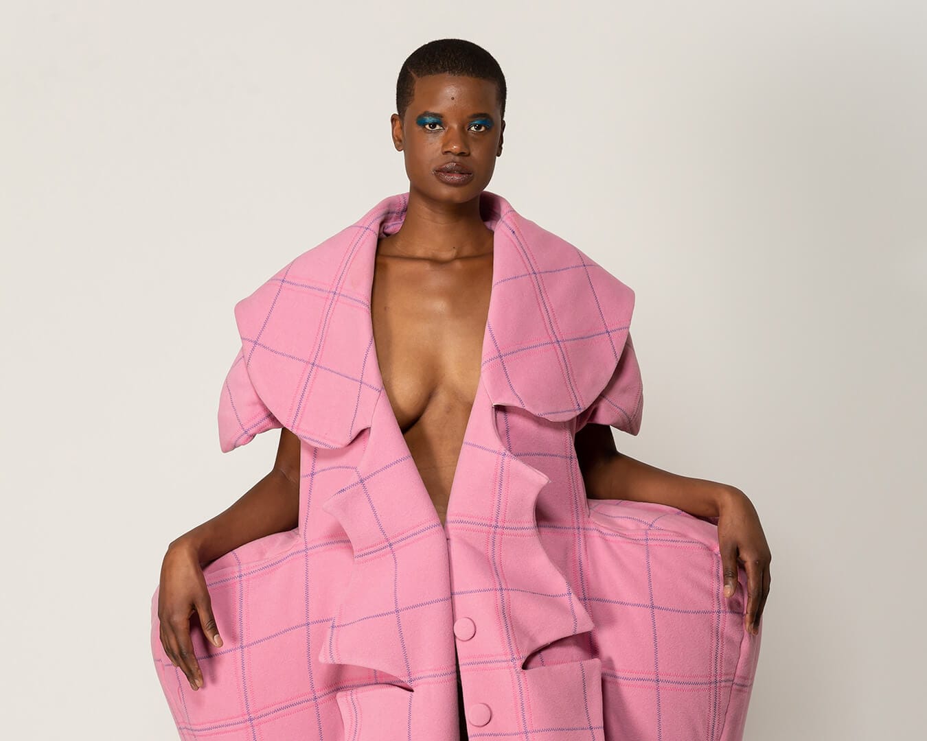 Padding is at the centre of this project that plays with volumes and drama. The outfit is constructed from the lining attached to the body to which two padded cushion-like structures are added to the front and back, creating distance between the body and the garment. The collar and neckline emphasise the female body and the distance between it and the final silhouette.
